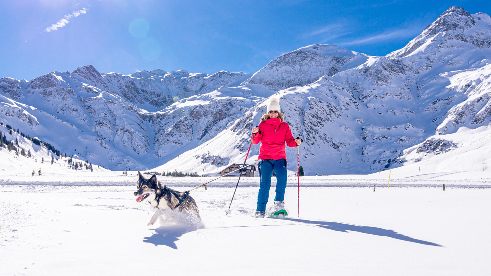 Geführte Schneeschuhwanderungen in malerischer Landschaft für sportliche Hundeliebhaber.